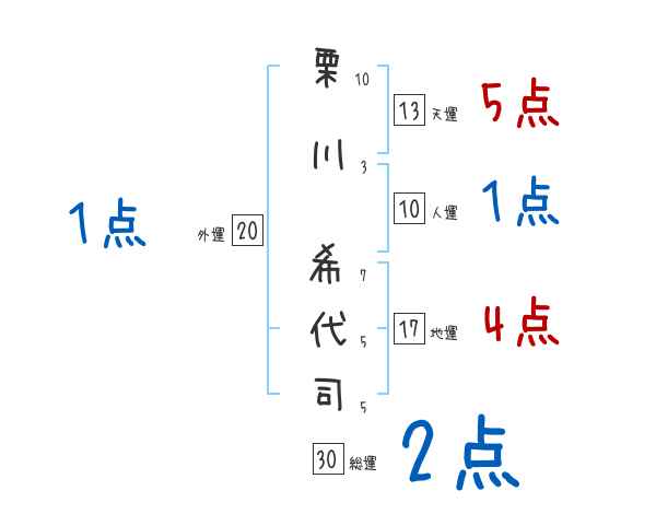 人運![]() | 栗川希代司さんの人運は10画の1つ星!不安を感じやすい傾向。ストレスを抱えないように注意しましょう。 性格や才能などを表す2番目に重要な運勢です。人間関係や協調性、社会的な成功に影響します。主に20歳から50歳ぐらいまでの中年期の運勢を表します。 |