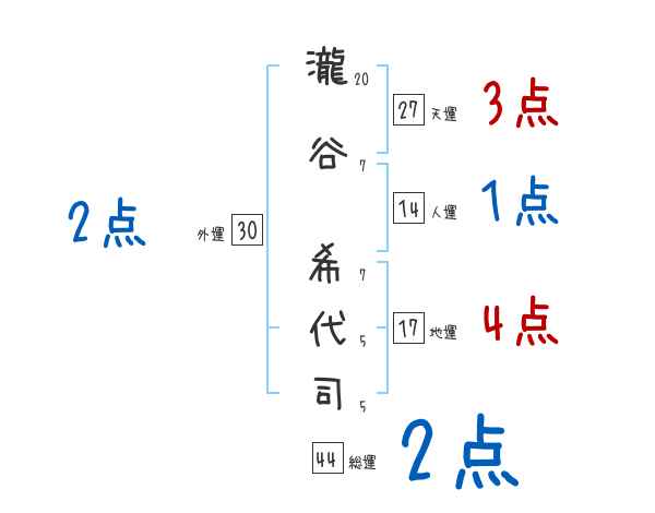 総運![]() | 瀧谷希代司さんの総運は44画の2つ星!誠実で慎重な性格。物事を考えすぎないように注意しましょう。 あなたの人生を表す1番重要な運勢です。生涯を通じて影響する総合運となり、主に50歳以降の晩年期に影響を及ぼします。 |