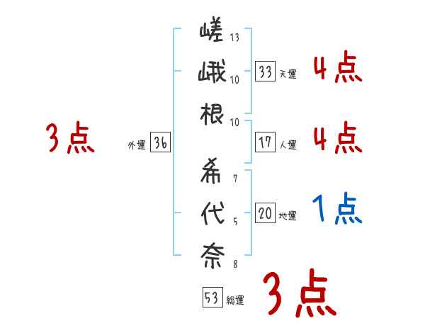 総運![]() | 嵯峨根希代奈さんの総運は53画の3つ星!やや見栄っ張りで虚栄心がある。散財に注意。 あなたの人生を表す1番重要な運勢です。生涯を通じて影響する総合運となり、主に50歳以降の晩年期に影響を及ぼします。 |
