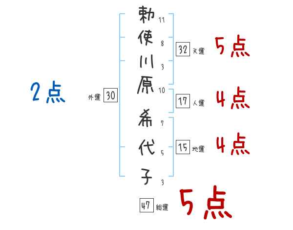 天運![]() | 勅使川原希代子さんの天運は32画の5つ星!柔軟性があり成功する。チャンスが多く金運が良い。 家系が持つ宿命的な運勢を表します。祖先から受け継いだ苗字ですので自分の力が及びません。家柄を象徴します。 |