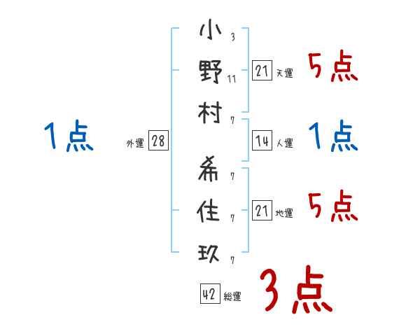 天運![]() | 小野村希住玖さんの天運は21画の5つ星!統率力がある。独立し成功する。名誉を手に入れる。 家系が持つ宿命的な運勢を表します。祖先から受け継いだ苗字ですので自分の力が及びません。家柄を象徴します。 |
