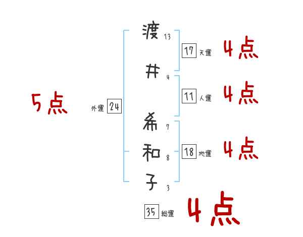 総運![]() | 渡井希和子さんの総運は35画の4つ星!温厚な性格で感受性が高い。穏和な性格で人望が厚い。 あなたの人生を表す1番重要な運勢です。生涯を通じて影響する総合運となり、主に50歳以降の晩年期に影響を及ぼします。 |