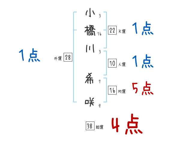 地運![]() | 小橋川希咲さんの地運は16画の5つ星!人望が厚く大きく発展する。逆転成功が見える。 個性を表す基礎的な運勢です。性格形成や対人関係、行動力など家庭環境に影響されます。主に誕生してから20歳くらいまでの若年期の運勢を表します。 |