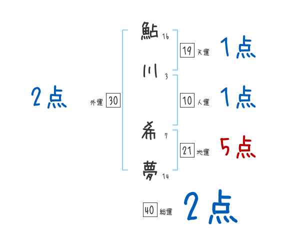 天運![]() | 鮎川希夢さんの天運は19画の1つ星!優れた才能を持ちますが、協調性が足りないことも。周りの人と協力する事を意識しましょう。 家系が持つ宿命的な運勢を表します。祖先から受け継いだ苗字ですので自分の力が及びません。家柄を象徴します。 |