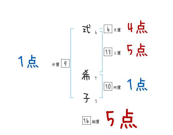 天運![]() | 式希子さんの天運は6画の4つ星!慎重な努力家で信頼を得る。誠実な精神で向上心に優れる。 家系が持つ宿命的な運勢を表します。祖先から受け継いだ苗字ですので自分の力が及びません。家柄を象徴します。 |