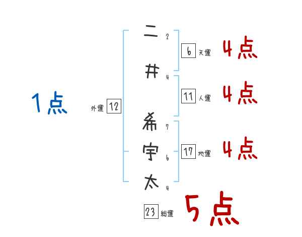 | 総運  | 二井希宇太さんの総運は23画の5つ星!想像力に優れ活力がある。一代で成功し名誉を手に入れる。あなたの人生を表す1番重要な運勢です。生涯を通じて影響する総合運となり、主に50歳以降の晩年期に影響を及ぼします。 |