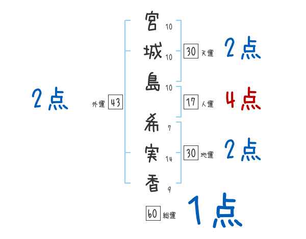 総運![]() | 宮城島希実香さんの総運は60画の1つ星!悲観的で迷いやすい。波乱が多く損をしないように。 あなたの人生を表す1番重要な運勢です。生涯を通じて影響する総合運となり、主に50歳以降の晩年期に影響を及ぼします。 |