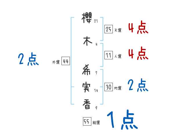 外運![]() | 櫻木希実香さんの外運は44画の2つ星!誠実で慎重な性格。物事を考えすぎないように注意しましょう。 生活面を象徴する運勢です。外部から受ける影響力を表し、結婚運、家庭運や職場、環境への順応性を表します。 |