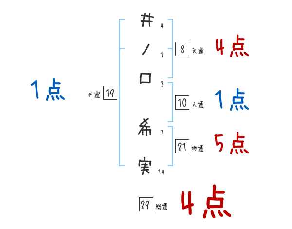 外運![]() | 井ノ口希実さんの外運は19画の1つ星!優れた才能を持ちますが、協調性が足りないことも。周りの人と協力する事を意識しましょう。 生活面を象徴する運勢です。外部から受ける影響力を表し、結婚運、家庭運や職場、環境への順応性を表します。 |