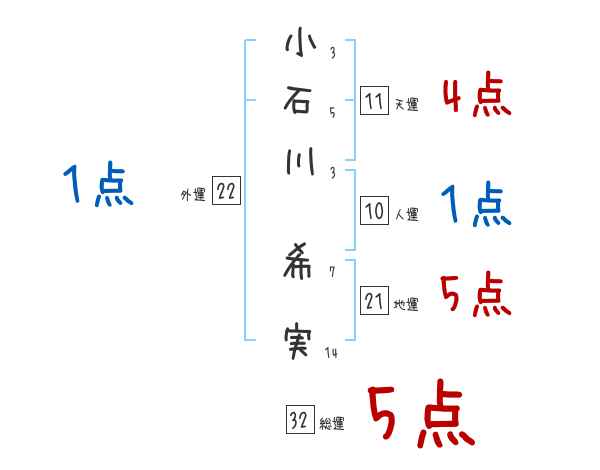 天運![]() | 小石川希実さんの天運は11画の4つ星!着実に富や地位を得る幸運な人生。 家系が持つ宿命的な運勢を表します。祖先から受け継いだ苗字ですので自分の力が及びません。家柄を象徴します。 |