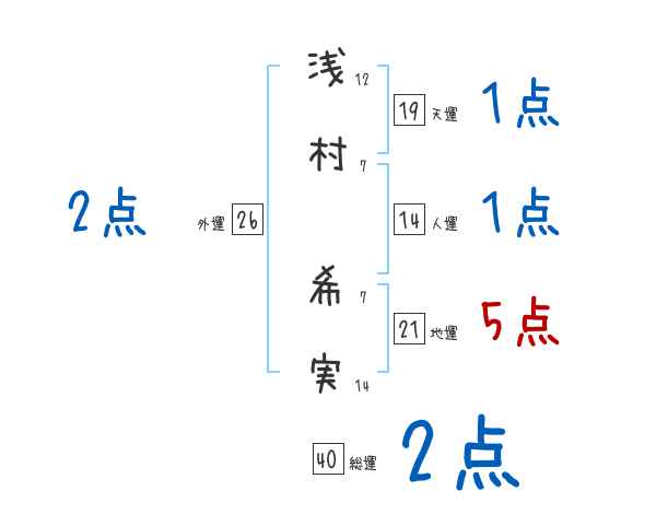 外運![]() | 浅村希実さんの外運は26画の2つ星!波瀾万丈かも。信頼できる人を大事にしましょう。 生活面を象徴する運勢です。外部から受ける影響力を表し、結婚運、家庭運や職場、環境への順応性を表します。 |