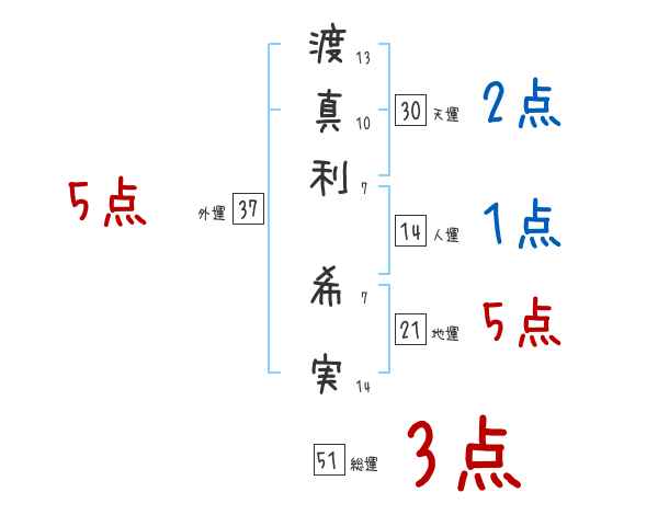 天運![]() | 渡真利希実さんの天運は30画の2つ星!浮き沈みの激しさに注意しましょう。 家系が持つ宿命的な運勢を表します。祖先から受け継いだ苗字ですので自分の力が及びません。家柄を象徴します。 |