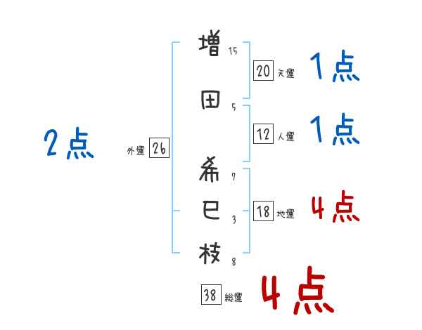 外運![]() | 増田希巳枝さんの外運は26画の2つ星!波瀾万丈かも。信頼できる人を大事にしましょう。 生活面を象徴する運勢です。外部から受ける影響力を表し、結婚運、家庭運や職場、環境への順応性を表します。 |