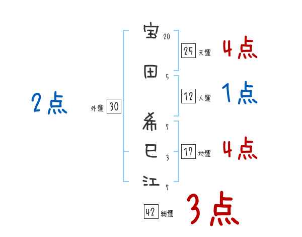 天運![]() | 宝田希巳江さんの天運は25画の4つ星!個性があり才能があふれる。強運の持ち主で発展する。 家系が持つ宿命的な運勢を表します。祖先から受け継いだ苗字ですので自分の力が及びません。家柄を象徴します。 |