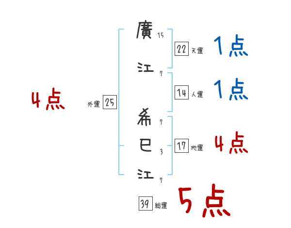 総運![]() | 廣江希巳江さんの総運は39画の5つ星!社交性に優れ人望が厚い。人の上に立ち成功する。 あなたの人生を表す1番重要な運勢です。生涯を通じて影響する総合運となり、主に50歳以降の晩年期に影響を及ぼします。 |