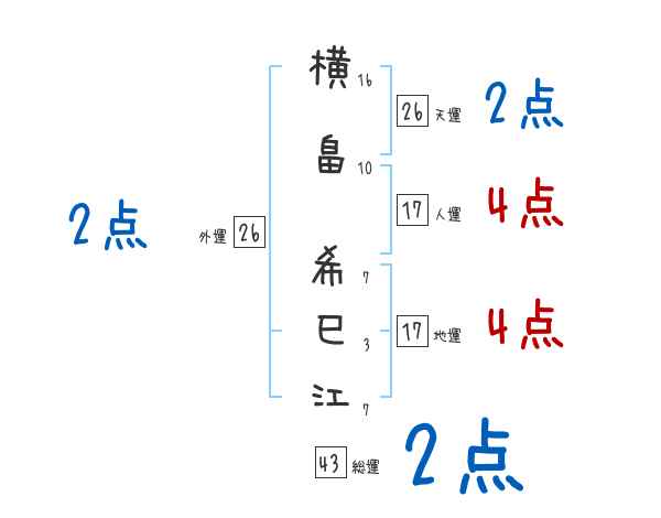 天運![]() | 横畠希巳江さんの天運は26画の2つ星!波瀾万丈かも。信頼できる人を大事にしましょう。 家系が持つ宿命的な運勢を表します。祖先から受け継いだ苗字ですので自分の力が及びません。家柄を象徴します。 |