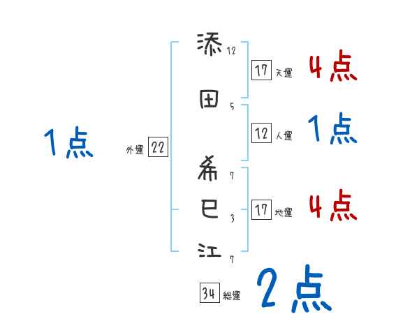 | 外運  | 添田希巳江さんの外運は22画の1つ星!努力することが苦手ないっぽう手先が器用。芸術性にも優れる。生活面を象徴する運勢です。外部から受ける影響力を表し、結婚運、家庭運や職場、環境への順応性を表します。 |
