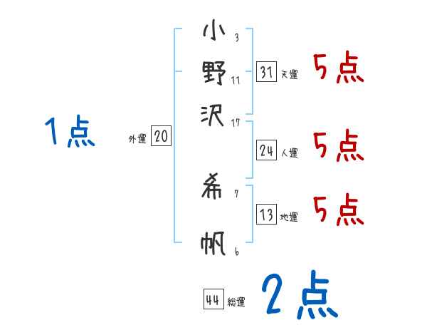 総運![]() | 小野沢希帆さんの総運は44画の2つ星!誠実で慎重な性格。物事を考えすぎないように注意しましょう。 あなたの人生を表す1番重要な運勢です。生涯を通じて影響する総合運となり、主に50歳以降の晩年期に影響を及ぼします。 |