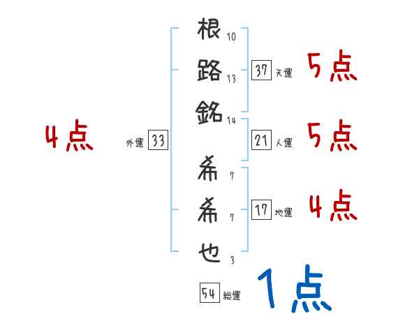 総運![]() | 根路銘希希也さんの総運は54画の1つ星!トラブルが多いかも。周りをよく見て協調して過ごしましょう。 あなたの人生を表す1番重要な運勢です。生涯を通じて影響する総合運となり、主に50歳以降の晩年期に影響を及ぼします。 |