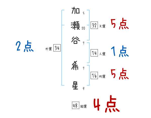 外運![]() | 加瀬谷希星さんの外運は34画の2つ星!独創性に優れるが、自尊心が強く災難に注意しましょう。 生活面を象徴する運勢です。外部から受ける影響力を表し、結婚運、家庭運や職場、環境への順応性を表します。 |