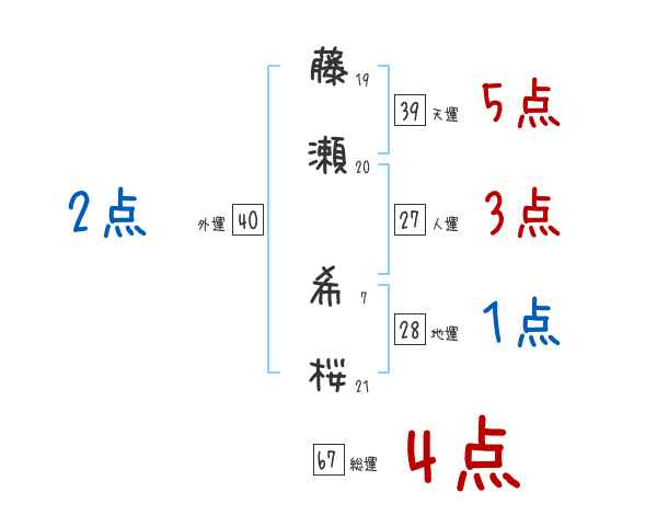 天運![]() | 藤瀬希桜さんの天運は39画の5つ星!社交性に優れ人望が厚い。人の上に立ち成功する。 家系が持つ宿命的な運勢を表します。祖先から受け継いだ苗字ですので自分の力が及びません。家柄を象徴します。 |