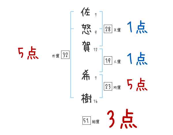 総運![]() | 佐怒賀希樹さんの総運は51画の3つ星!変化が激しく、危険に注意。堅実な性格。 あなたの人生を表す1番重要な運勢です。生涯を通じて影響する総合運となり、主に50歳以降の晩年期に影響を及ぼします。 |