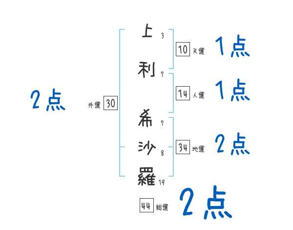 総運![]() | 上利希沙羅さんの総運は44画の2つ星!誠実で慎重な性格。物事を考えすぎないように注意しましょう。 あなたの人生を表す1番重要な運勢です。生涯を通じて影響する総合運となり、主に50歳以降の晩年期に影響を及ぼします。 |