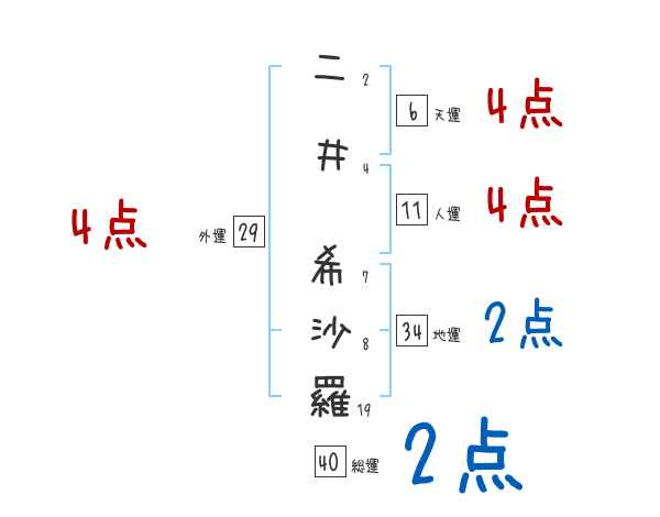 外運![]() | 二井希沙羅さんの外運は29画の4つ星!完全主義で才能がある。厳格な心の持ち主。 生活面を象徴する運勢です。外部から受ける影響力を表し、結婚運、家庭運や職場、環境への順応性を表します。 |