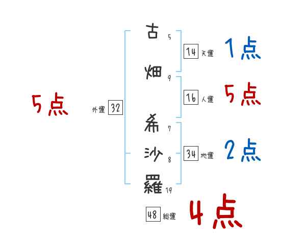 外運![]() | 古畑希沙羅さんの外運は32画の5つ星!柔軟性があり成功する。チャンスが多く金運が良い。 生活面を象徴する運勢です。外部から受ける影響力を表し、結婚運、家庭運や職場、環境への順応性を表します。 |