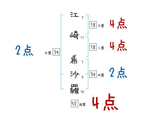 天運![]() | 江崎希沙羅さんの天運は18画の4つ星!情熱的で剛気。忍耐力があり信頼される。 家系が持つ宿命的な運勢を表します。祖先から受け継いだ苗字ですので自分の力が及びません。家柄を象徴します。 |