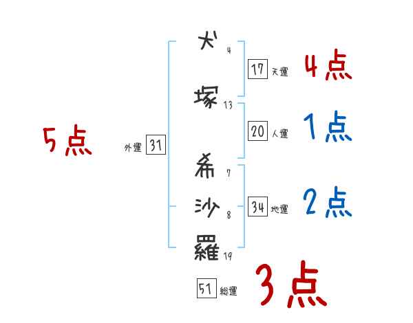 天運![]() | 犬塚希沙羅さんの天運は17画の4つ星!積極的な行動力。地位を気づき財産を手に入れる。純粋な心と直感力。 家系が持つ宿命的な運勢を表します。祖先から受け継いだ苗字ですので自分の力が及びません。家柄を象徴します。 |