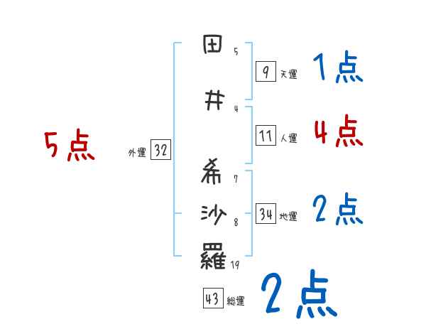 外運![]() | 田井希沙羅さんの外運は32画の5つ星!柔軟性があり成功する。チャンスが多く金運が良い。 生活面を象徴する運勢です。外部から受ける影響力を表し、結婚運、家庭運や職場、環境への順応性を表します。 |