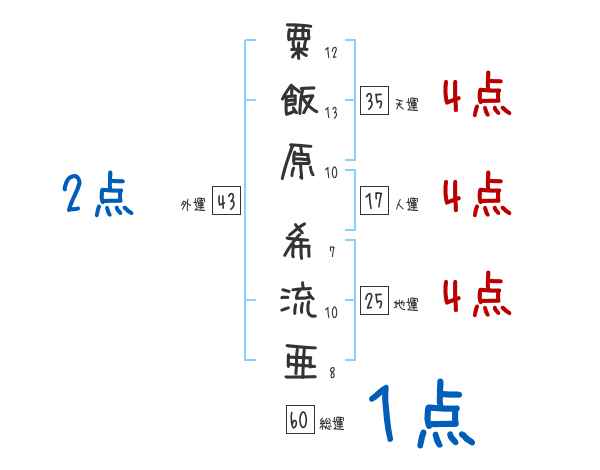 総運![]() | 粟飯原希流亜さんの総運は60画の1つ星!悲観的で迷いやすい。波乱が多く損をしないように。 あなたの人生を表す1番重要な運勢です。生涯を通じて影響する総合運となり、主に50歳以降の晩年期に影響を及ぼします。 |