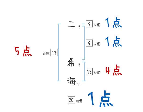 総運![]() | 二希海さんの総運は20画の1つ星!社交が苦手。人とは違った才能があり波乱万丈な人生かも。 あなたの人生を表す1番重要な運勢です。生涯を通じて影響する総合運となり、主に50歳以降の晩年期に影響を及ぼします。 |