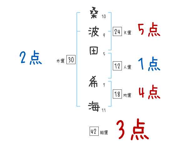 外運![]() | 桑波田希海さんの外運は30画の2つ星!浮き沈みの激しさに注意しましょう。 生活面を象徴する運勢です。外部から受ける影響力を表し、結婚運、家庭運や職場、環境への順応性を表します。 |