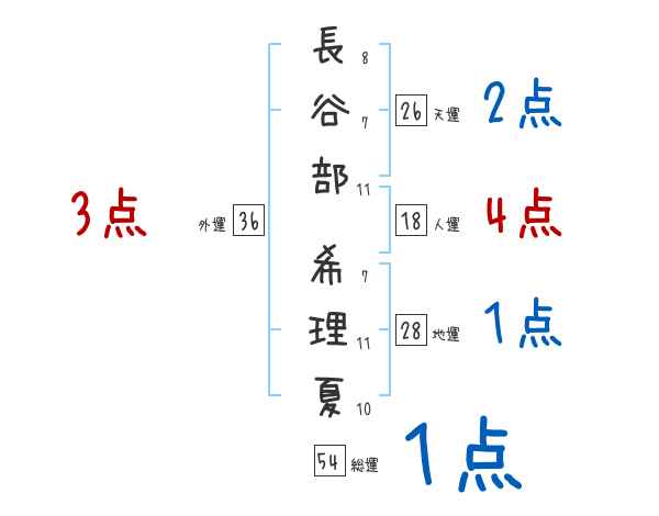天運![]() | 長谷部希理夏さんの天運は26画の2つ星!波瀾万丈かも。信頼できる人を大事にしましょう。 家系が持つ宿命的な運勢を表します。祖先から受け継いだ苗字ですので自分の力が及びません。家柄を象徴します。 |