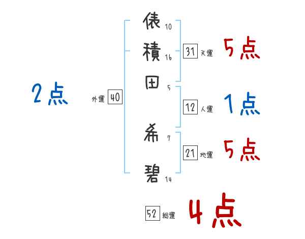 外運![]() | 俵積田希碧さんの外運は40画の2つ星!自信過剰で物事に固執するためトラブルに注意。 生活面を象徴する運勢です。外部から受ける影響力を表し、結婚運、家庭運や職場、環境への順応性を表します。 |