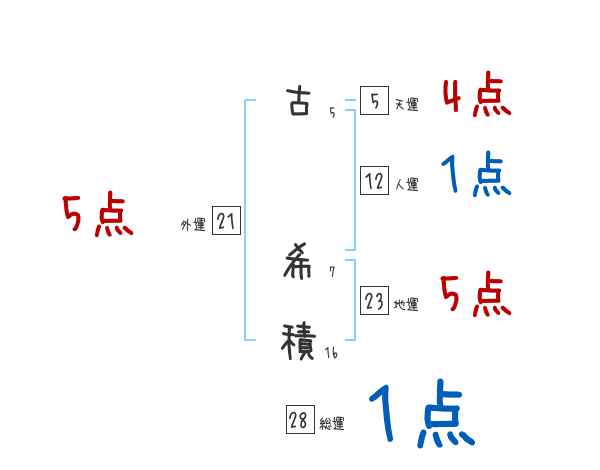 天運![]() | 古希積さんの天運は5画の4つ星!健康で安泰。協調性に優れ、財産に恵まれる。 家系が持つ宿命的な運勢を表します。祖先から受け継いだ苗字ですので自分の力が及びません。家柄を象徴します。 |