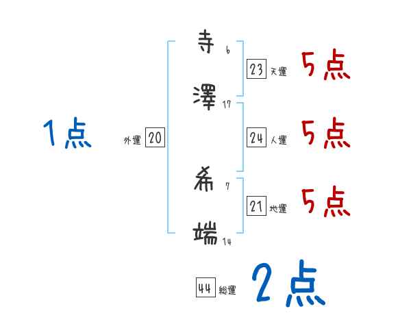 天運![]() | 寺澤希端さんの天運は23画の5つ星!想像力に優れ活力がある。一代で成功し名誉を手に入れる。 家系が持つ宿命的な運勢を表します。祖先から受け継いだ苗字ですので自分の力が及びません。家柄を象徴します。 |