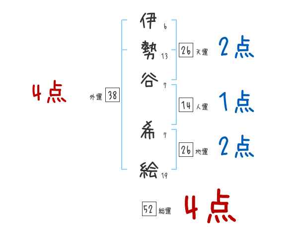 天運![]() | 伊勢谷希絵さんの天運は26画の2つ星!波瀾万丈かも。信頼できる人を大事にしましょう。 家系が持つ宿命的な運勢を表します。祖先から受け継いだ苗字ですので自分の力が及びません。家柄を象徴します。 |