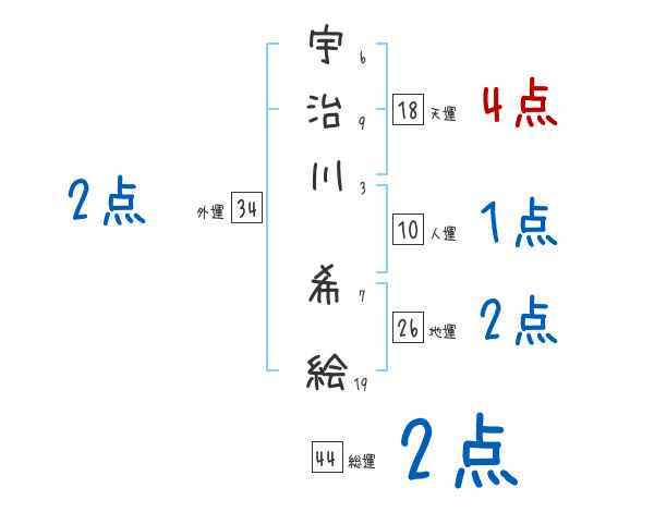 総運![]() | 宇治川希絵さんの総運は44画の2つ星!誠実で慎重な性格。物事を考えすぎないように注意しましょう。 あなたの人生を表す1番重要な運勢です。生涯を通じて影響する総合運となり、主に50歳以降の晩年期に影響を及ぼします。 |