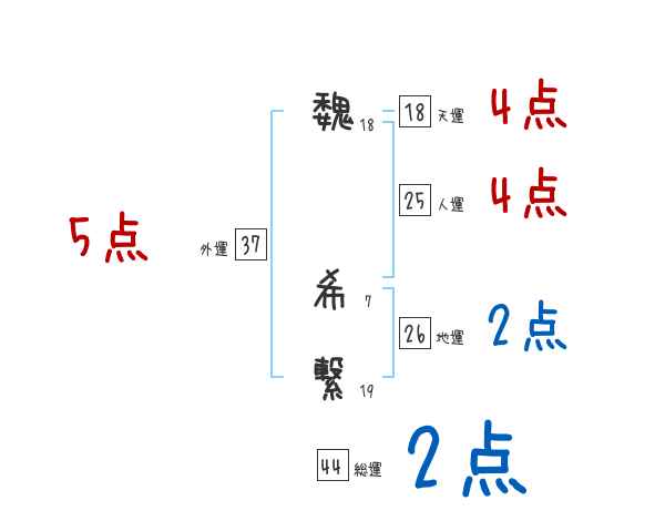 外運![]() | 魏希繋さんの外運は37画の5つ星!努力家で順応性に優れる。現実的な考え方ができ忠実に物事をこなす。 生活面を象徴する運勢です。外部から受ける影響力を表し、結婚運、家庭運や職場、環境への順応性を表します。 |
