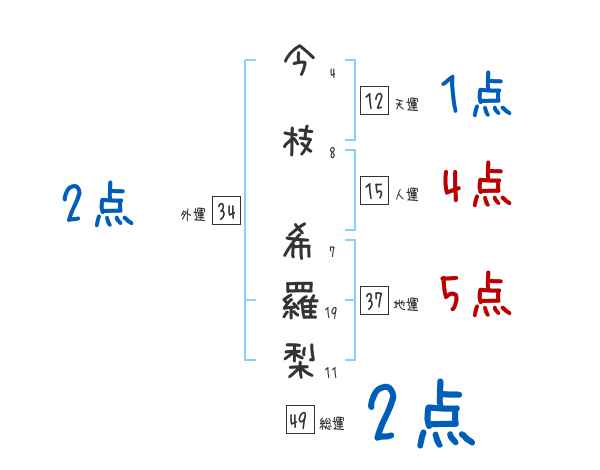 天運![]() | 今枝希羅梨さんの天運は12画の1つ星!簡単な失敗で諦めてしまいやすいかも。着実に行動すると良いでしょう。 家系が持つ宿命的な運勢を表します。祖先から受け継いだ苗字ですので自分の力が及びません。家柄を象徴します。 |