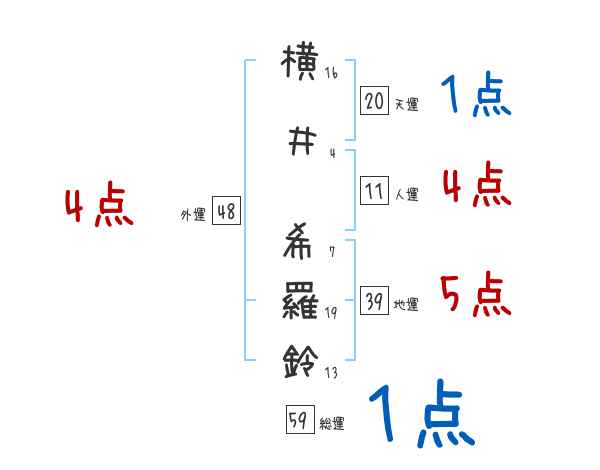 地運![]() | 横井希羅鈴さんの地運は39画の5つ星!社交性に優れ人望が厚い。人の上に立ち成功する。 個性を表す基礎的な運勢です。性格形成や対人関係、行動力など家庭環境に影響されます。主に誕生してから20歳くらいまでの若年期の運勢を表します。 |