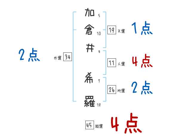 外運![]() | 加倉井希羅さんの外運は34画の2つ星!独創性に優れるが、自尊心が強く災難に注意しましょう。 生活面を象徴する運勢です。外部から受ける影響力を表し、結婚運、家庭運や職場、環境への順応性を表します。 |