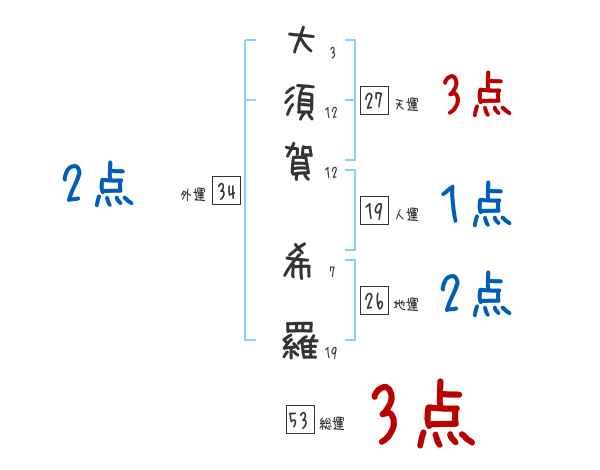 総運![]() | 大須賀希羅さんの総運は53画の3つ星!やや見栄っ張りで虚栄心がある。散財に注意。 あなたの人生を表す1番重要な運勢です。生涯を通じて影響する総合運となり、主に50歳以降の晩年期に影響を及ぼします。 |