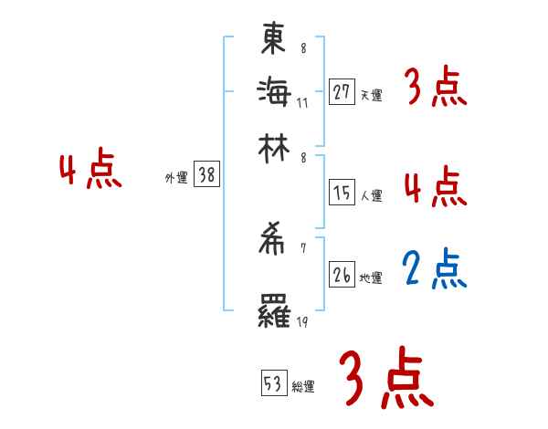 総運![]() | 東海林希羅さんの総運は53画の3つ星!やや見栄っ張りで虚栄心がある。散財に注意。 あなたの人生を表す1番重要な運勢です。生涯を通じて影響する総合運となり、主に50歳以降の晩年期に影響を及ぼします。 |