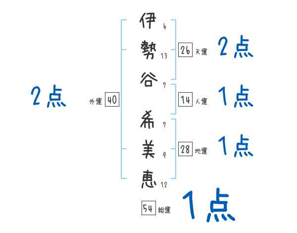 天運![]() | 伊勢谷希美恵さんの天運は26画の2つ星!波瀾万丈かも。信頼できる人を大事にしましょう。 家系が持つ宿命的な運勢を表します。祖先から受け継いだ苗字ですので自分の力が及びません。家柄を象徴します。 |