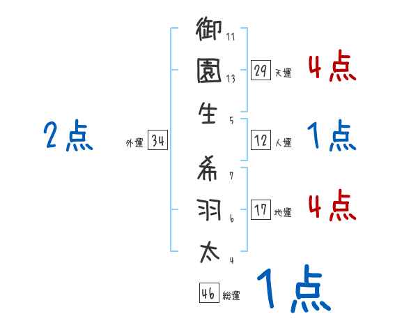 総運![]() | 御園生希羽太さんの総運は46画の1つ星!迷走することが多く苦労するかも。目先のことにとらわれないように。 あなたの人生を表す1番重要な運勢です。生涯を通じて影響する総合運となり、主に50歳以降の晩年期に影響を及ぼします。 |
