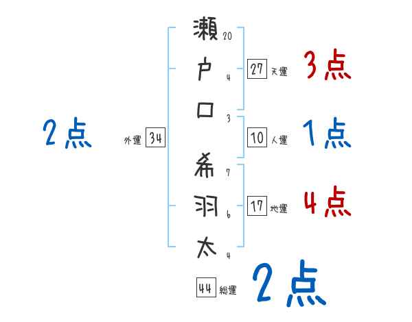 総運![]() | 瀬戸口希羽太さんの総運は44画の2つ星!誠実で慎重な性格。物事を考えすぎないように注意しましょう。 あなたの人生を表す1番重要な運勢です。生涯を通じて影響する総合運となり、主に50歳以降の晩年期に影響を及ぼします。 |